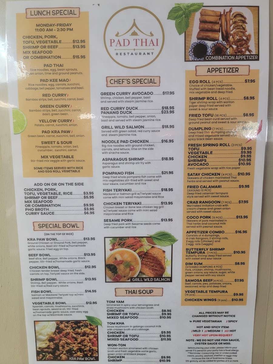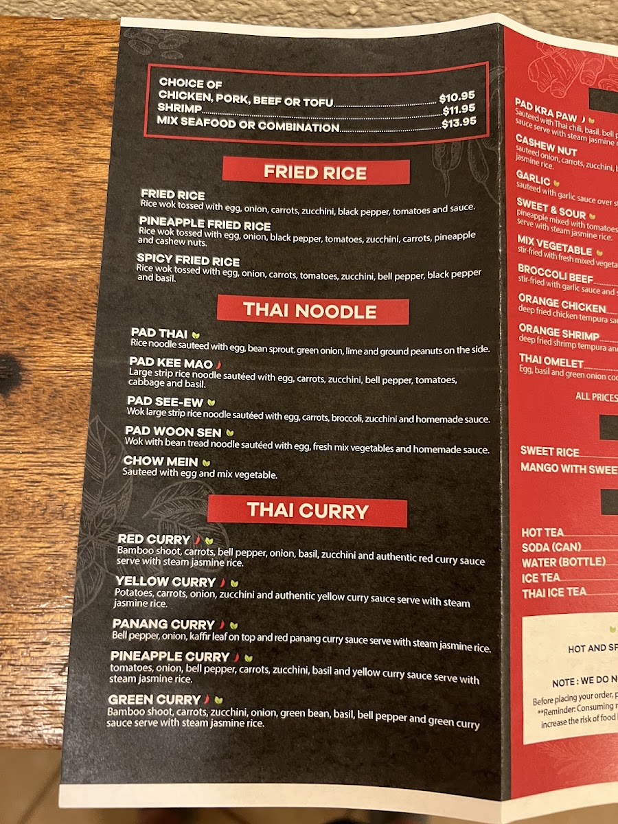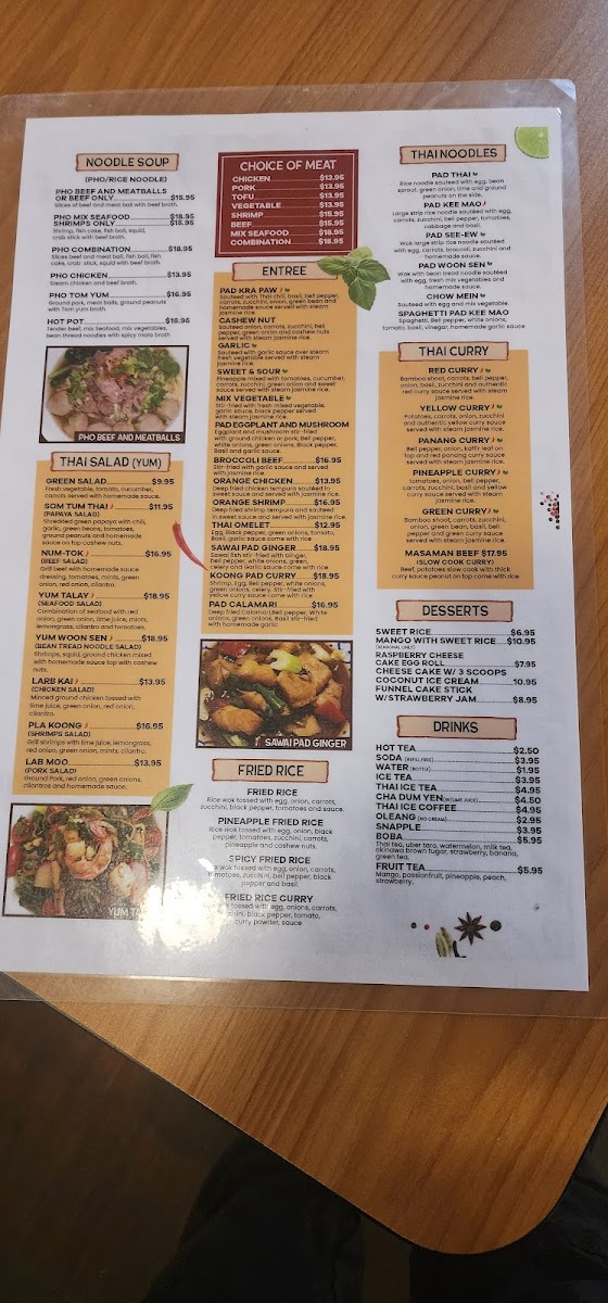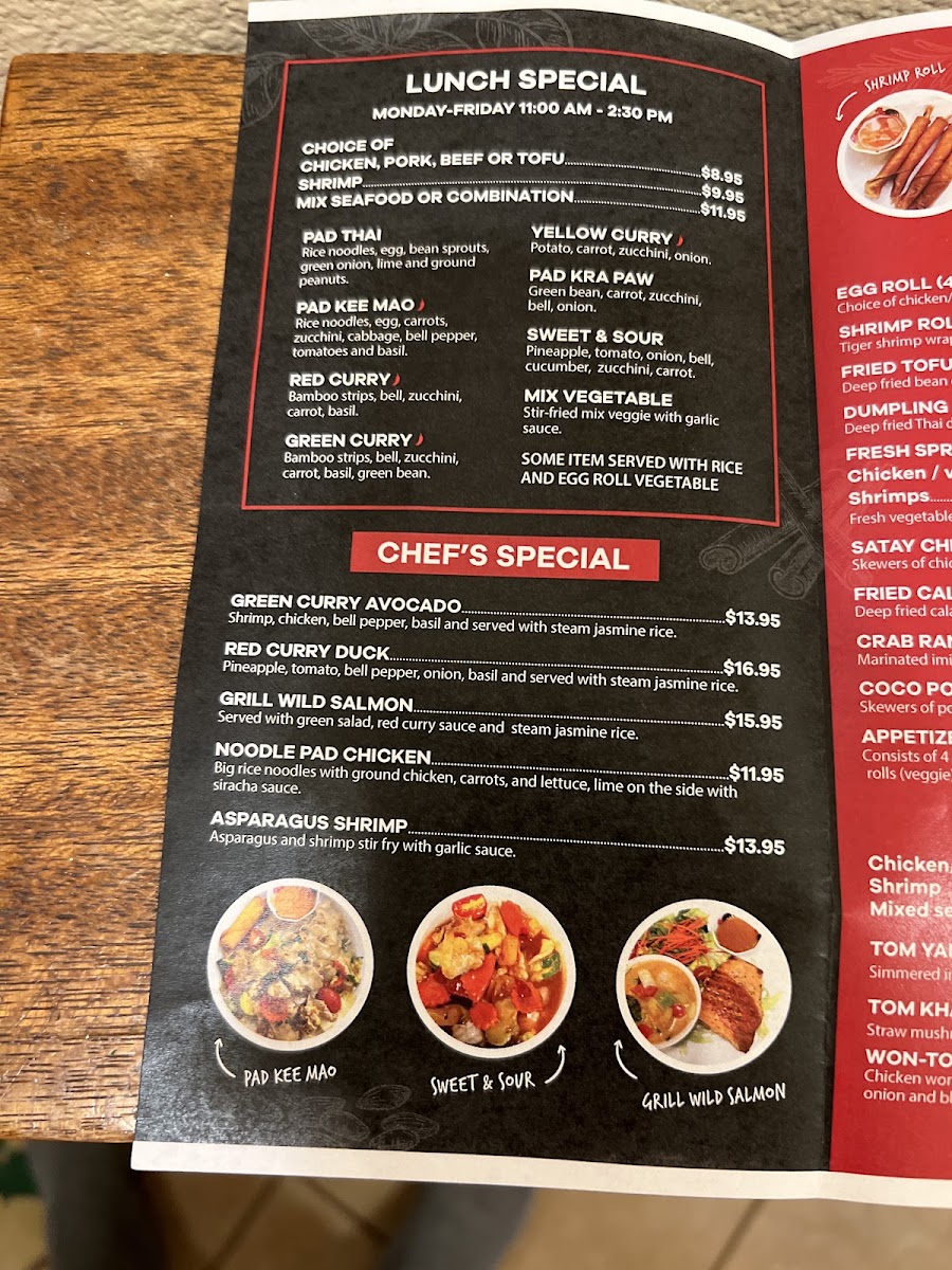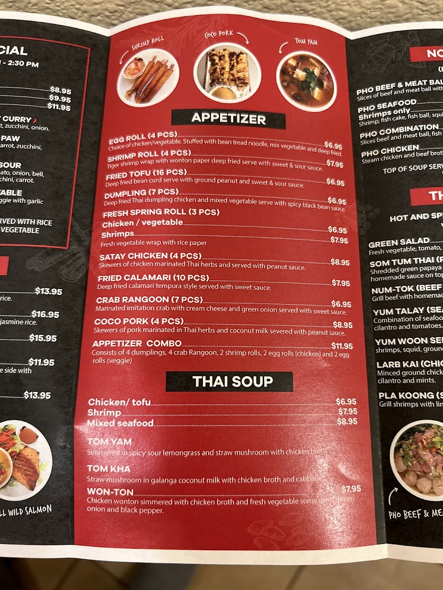 The menu showcases a diverse range of dishes that cater to various palates, including mouthwatering options like Larb Gai, a refreshing chicken salad, and the ever-popular Chicken Pad Thai, praised by patrons for its perfect balance of flavor. Seafood lovers will delight in the Yum Talay, a vibrant seafood salad that celebrates freshness.